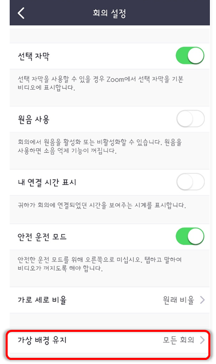 여기에서 가상배경 유지를 모든 회의로 설정하시고요.