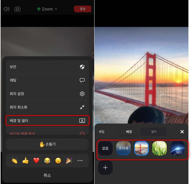 회의 접속 후 더보기 -> 배경 및 필터에서 원하시는 배경을 선택하시면 됩니다.