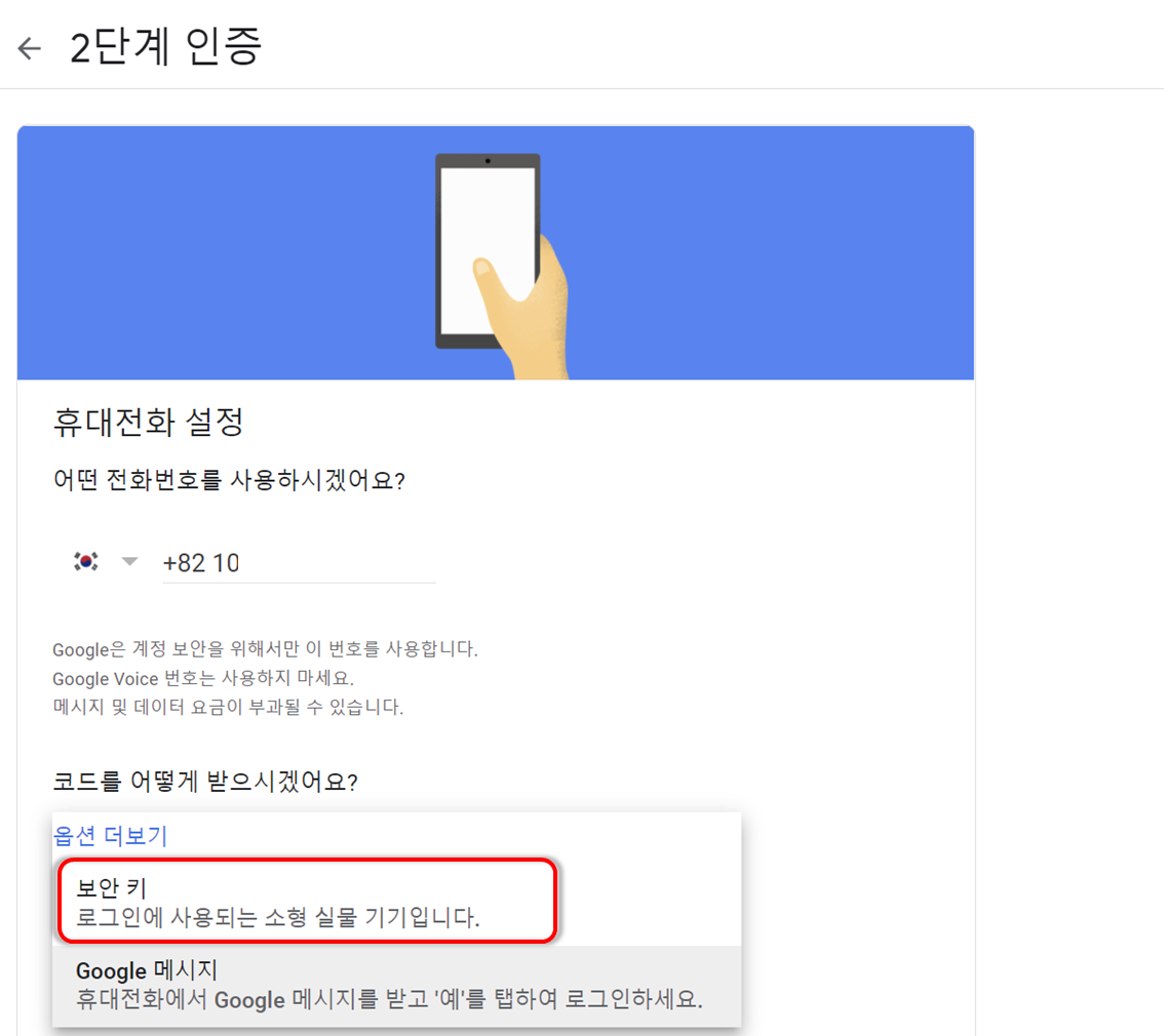 기본값은 휴대폰 번호로 인증을 받는 것이지만, 저는 보안키로 변경해보겠습니다.