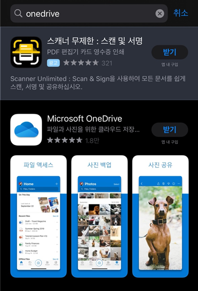 먼저 안드로이드처럼 앱스토어에서 onedrive를 검색한 후 아이폰에 설치해줍니다.