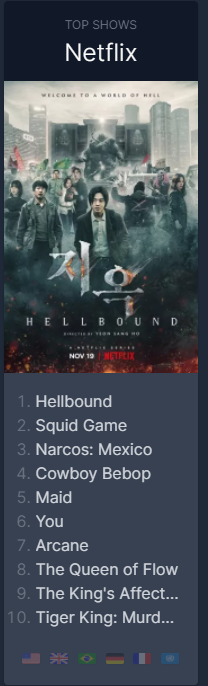 공개된지 단 하루만에 PlixPatrol 기준으로 넷플릭스의 1위는 지옥(Hellbound) 2위는 오징어 게임입니다.