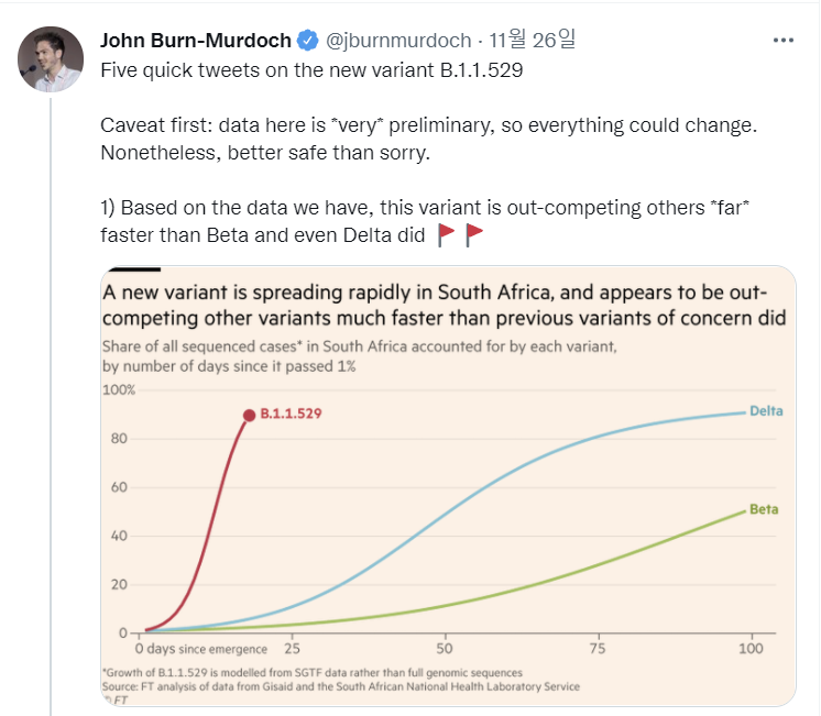 실제로 John Burn-Murdoch(파이넨스 타임즈 수석 데이터 리포터)은 아직 오미크론에 대한 데이터가 부족하나