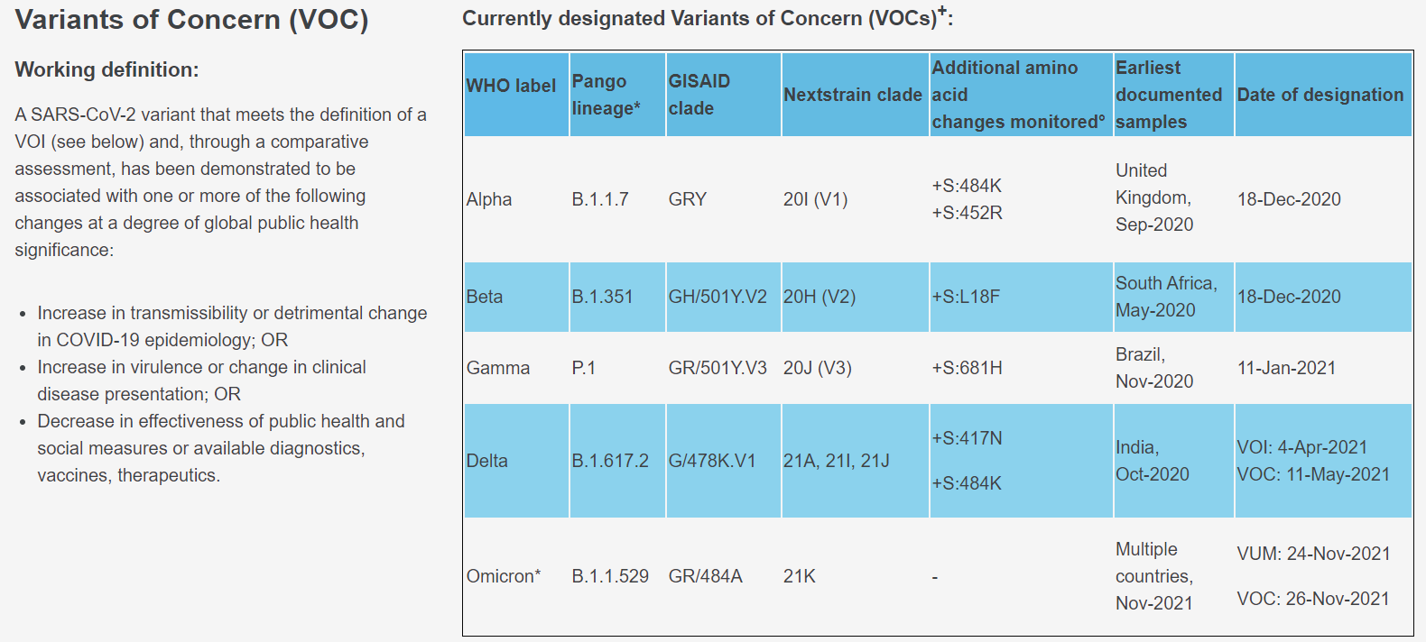 현재 변이들의 정보는 WHO 페이지에서 확인할 수 있습니다.