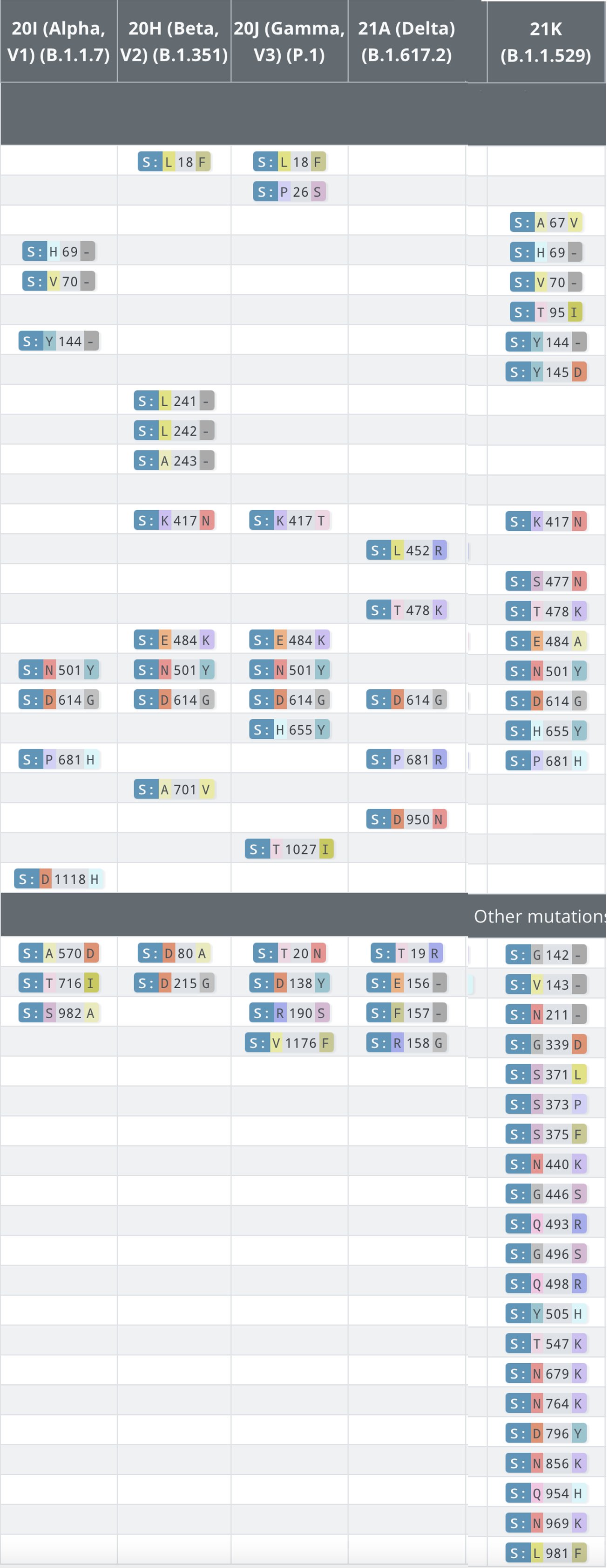 현재까지 알려진 변이는 아래 표를 통해서 정리한 자료가 있어서 첨부드립니다.
