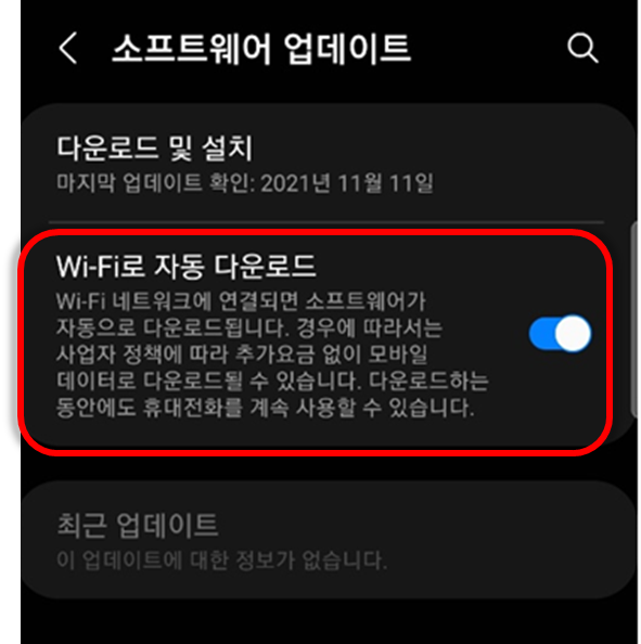 해당 메뉴를 끄고, 이동통신망(LTE 또는 5G)만 사용하는 경우 자동으로 업데이트가 되지 않습니다.