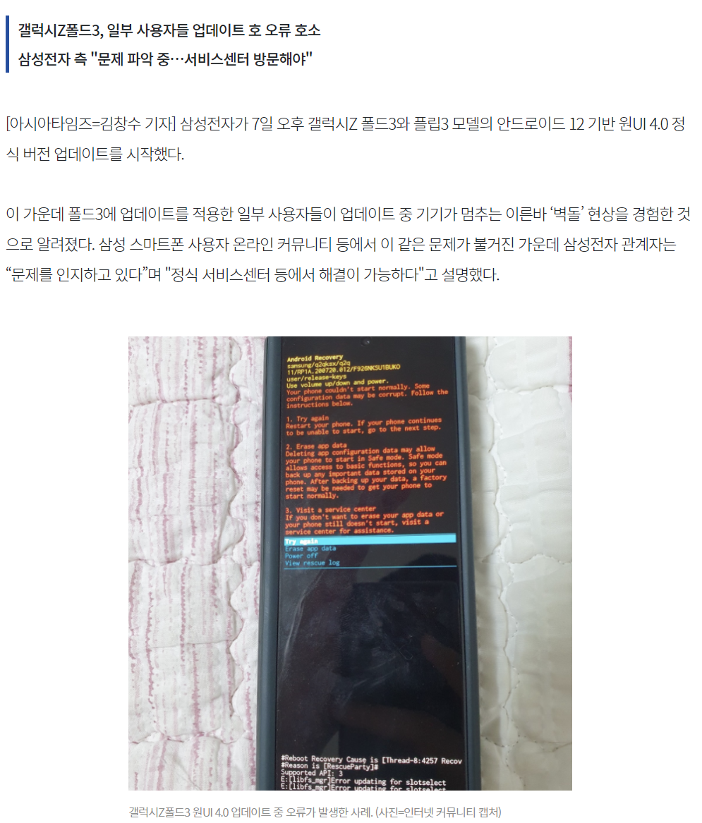 갤럭시Z폴드3의 경우 자동업데이트 중 벽돌이 되는 현상이 발생하는데요.