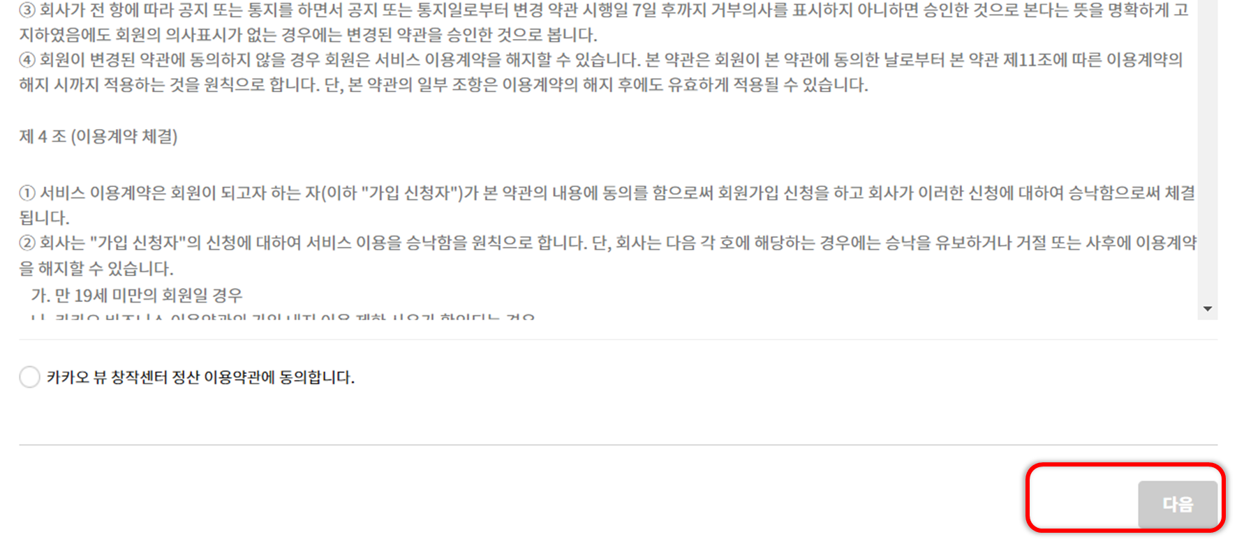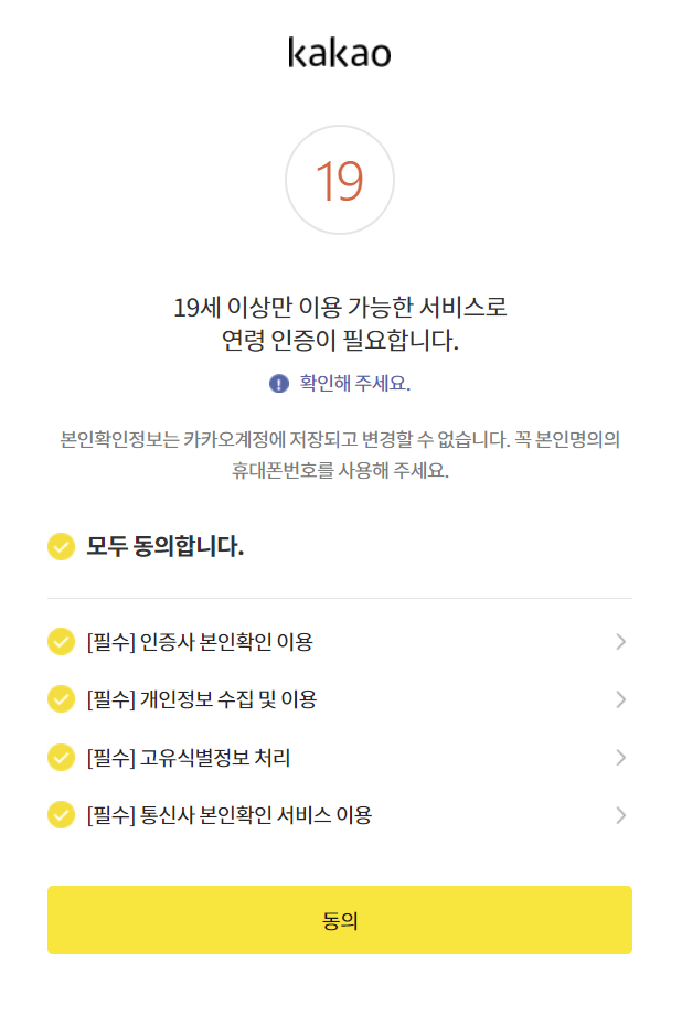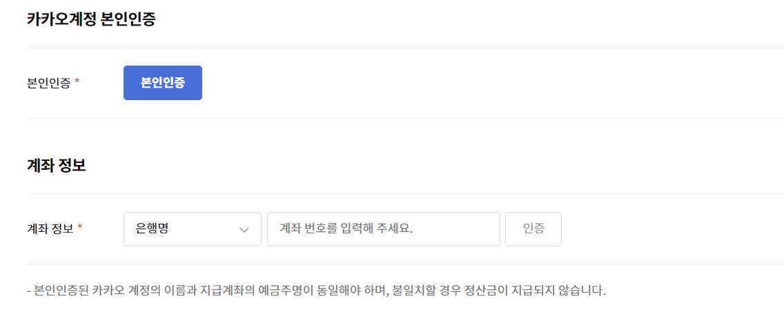 이때 수익창출 프로그램의 경우 카카오계정과 동일한 사람이어야 하며, 19세 이상만 사용가능한 서비스입니다.