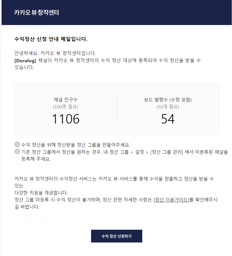 위에 안내한 해당 조건을 만족하면 아래와 같이 수익 정산 신청 메일이 날아옵니다.