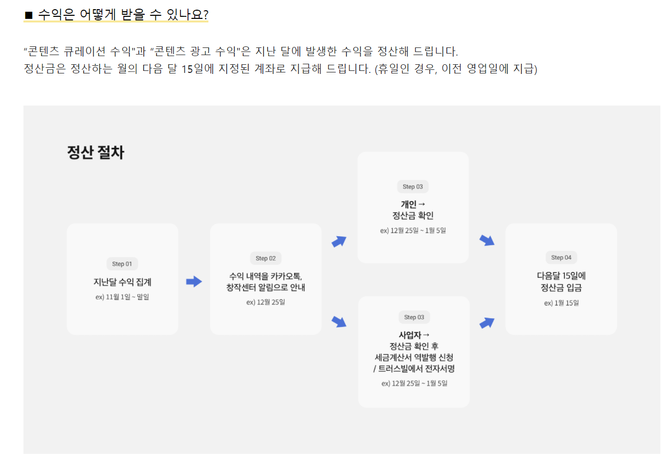 - 콘텐츠 광고 수익 : 카카오의 다양한 콘텐츠 서비스들 중 창작센터와 연동하여 콘텐츠를 직접 생산하는 분들에게 지급