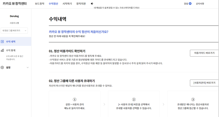해당 메뉴를 누르면, 카카오뷰 창작센터 -> 수익정산 메뉴에 진입합니다.