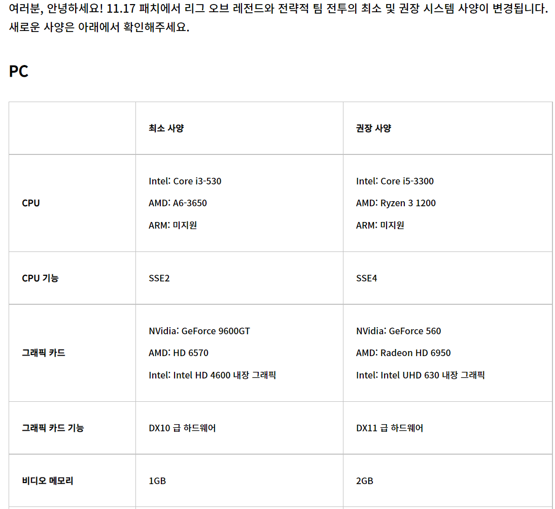 롤의 경우 권장사항이 낮은데요. Geforce 560 이상이면 가능합니다.