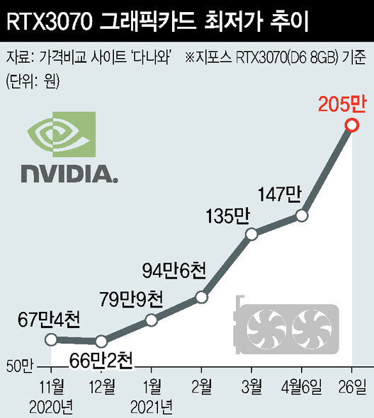 그리고 암호화폐가 등장하면서 그래픽카드로 채굴이되면서 그래픽 카드의 가격은 천정부지로 오르게 됩니다.