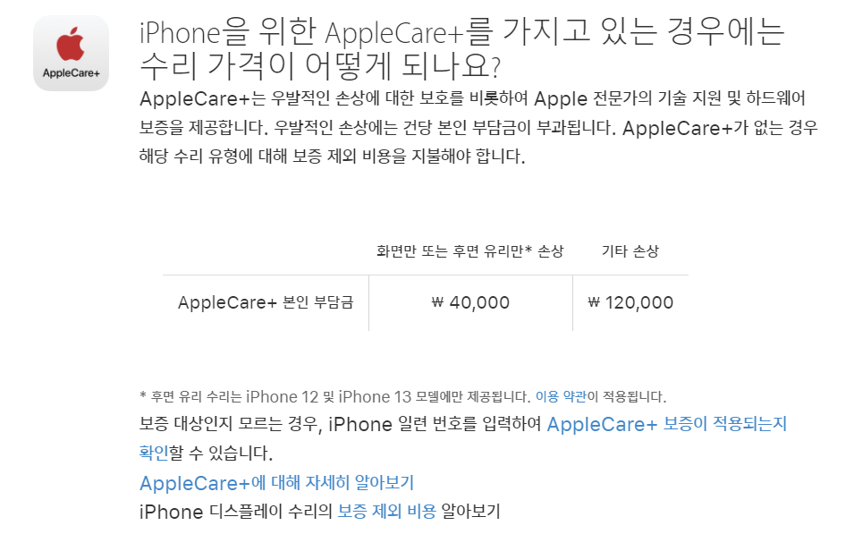(iPhone 12, 13 시리즈만 해당) ₩40,000, 리퍼 ₩120,000 |