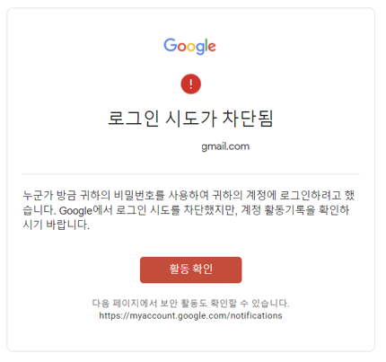 로그인 시도가 차단되었다는 메일이 와 있을겁니다.