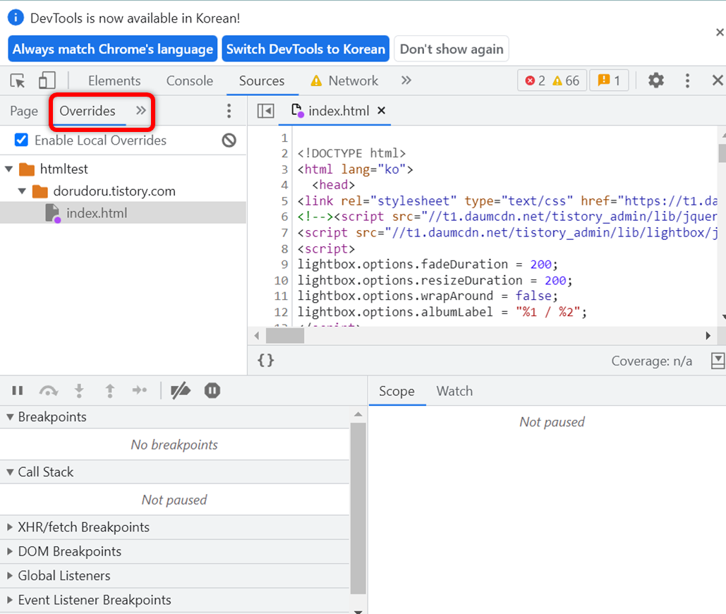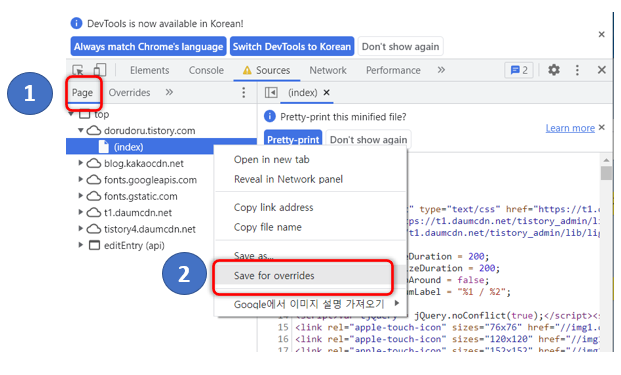 컴퓨터에 저장된 파일인데요. Overrides에 있는 index.html 파일을 수정하시면 새로고침하더라도 수정이 됩니다.