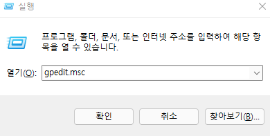 윈도우키 + R을 눌러 실행 메뉴에서 gpedit.msc를 입력합니다.