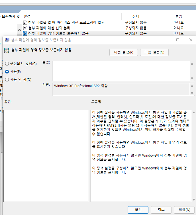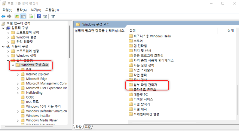 Windows 구성 요소 - 첨부파일 관리자 메뉴로 진입합니다.