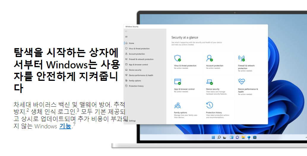 차세대 바이러스 백신 및 맬웨어 방어, 추적 방지 및 기타 보안 기능이 함께 제공되는 Windows 보안으로 데이터와 디바이스를 보호하세요.