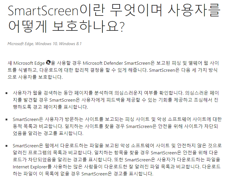 스마트 스크린은 출처를 알 수 없는 웹페이지나 기존에 알려진 악성 소프트웨어의 출처를 보관하여
