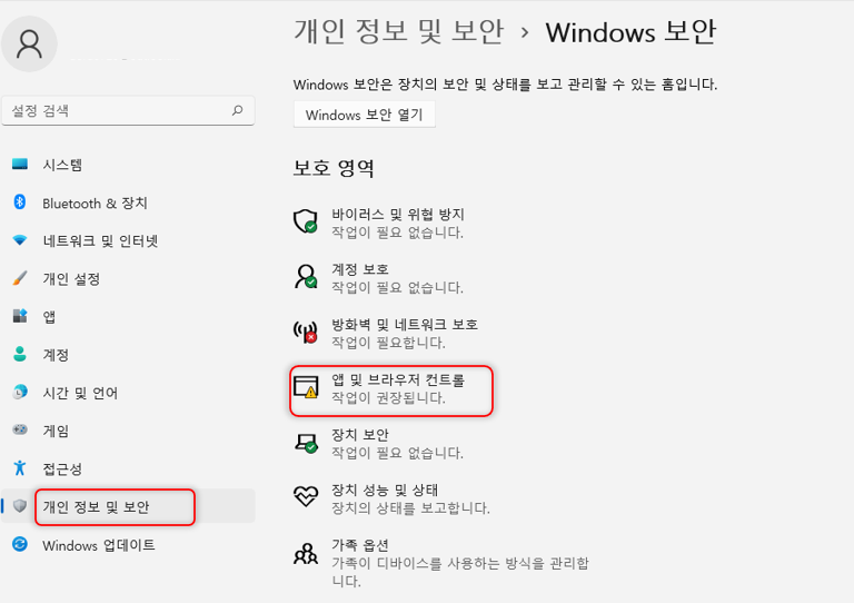 설정 - 개인정보 및 보안 - 앱 및 브라우저 컨트롤 메뉴에 들어갑니다.