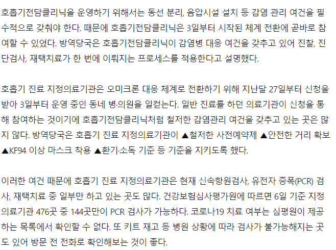 하지만 호흡기 진료 지정 의료기관은 오미크론 대응 체계로 전환하기 위해 신청 받아서 운영하는 곳입니다.