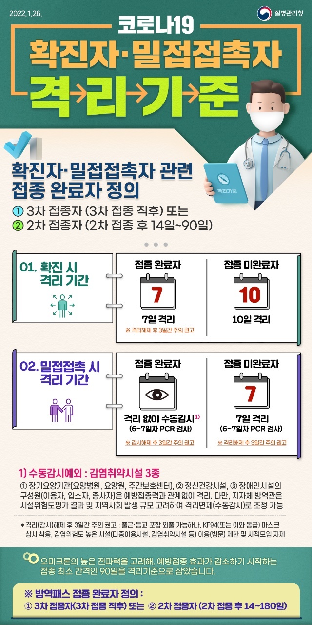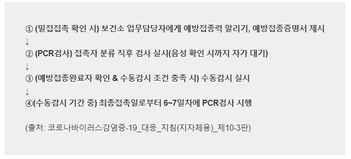 밀접접촉시 접종 완료자는 수동 감시이며, 접종 미완료자는 7일 격리입니다.