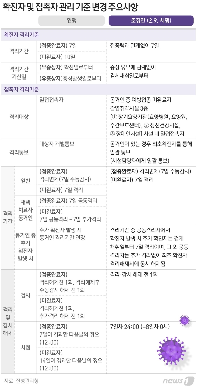 코로나19 확진자 및 접촉자 관리 기준 변경 주요 사항