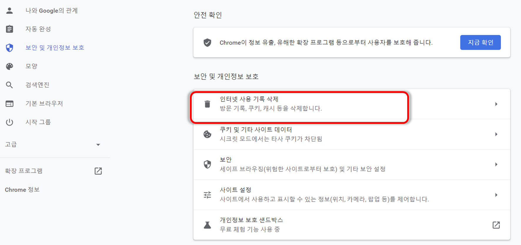 그리고 크롬의 캐시를 지우면 일시적으로 메모리 사용량을 줄일 수 있습니다.