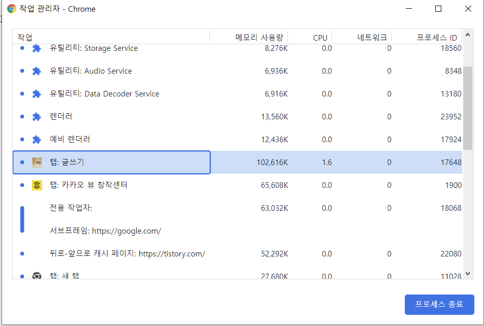 또한 크롬 자체의 작업 관리자를 실행해서 프로세스를 줄일 수 있는데요.