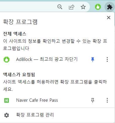 상단의 확장 프로그램을 클릭하여 미사용하는 확장 프로그램을 지우면 좋습니다.