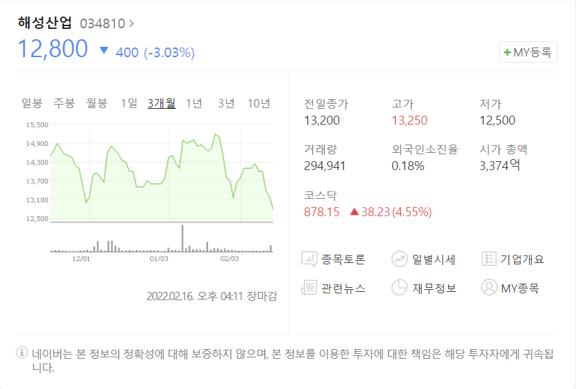 이에 해성 산업의 주가도 3%하락하였습니다.