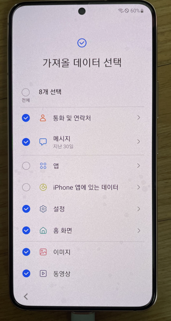 전체를 하셔도 되고, 저는 홈 화면과 메시지 통화 연락처, 이미지 등만 이동하였습니다.