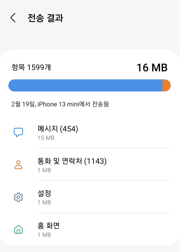 저의 경우 메지와 통화 및 연락처 홈 화면이 정상적으로 전송되었다고 나옵니다.