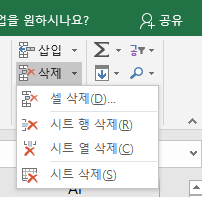 이 후 홈 메뉴의 삭제 -> 시트 행 삭제와 시트 열 삭제를 하면 되는데요.