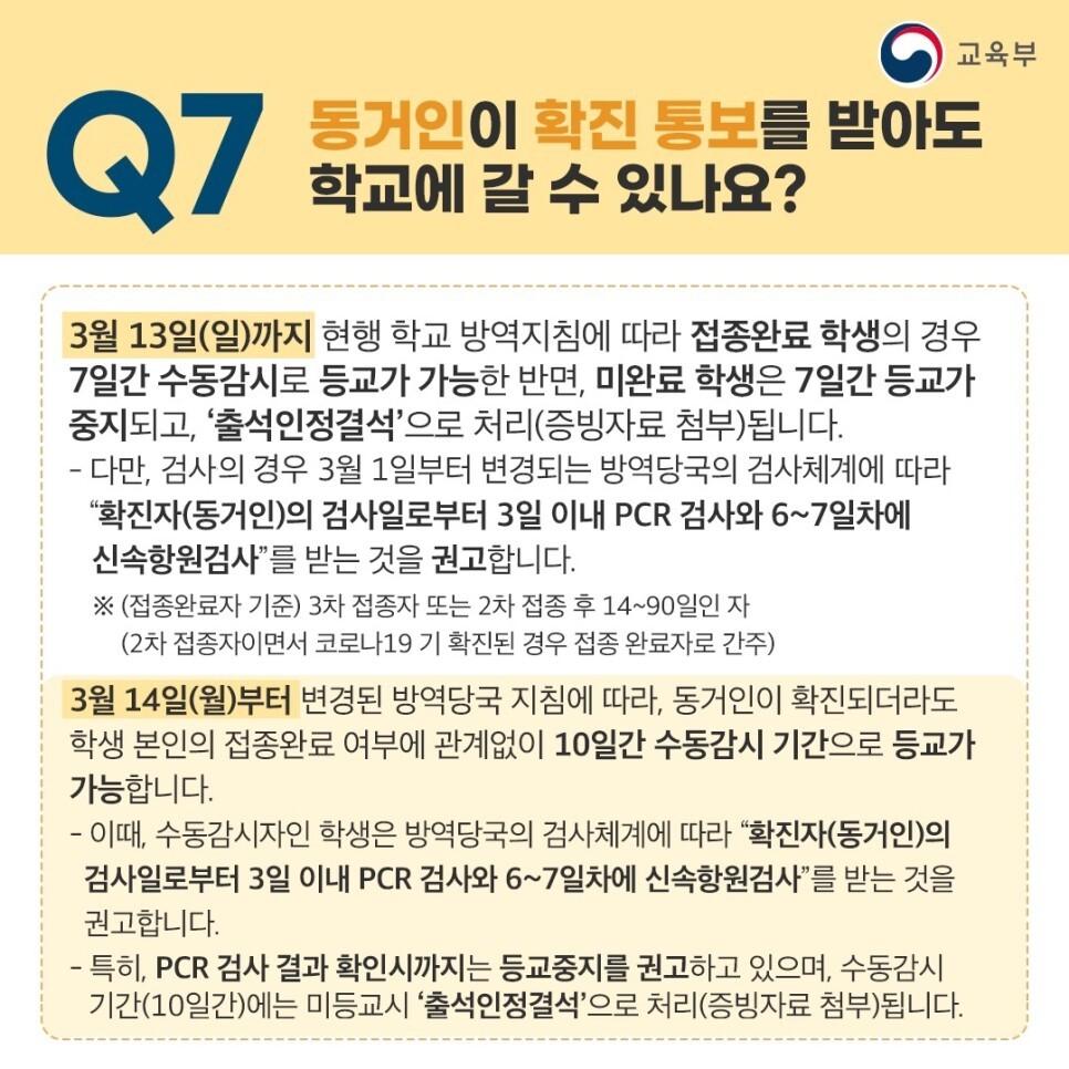 - 가족 확진되더라도 본인이 PCR 음성이면 등교가능(3월 14일 이후)