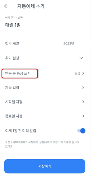 또한 이체 1일전 미리 알림 기능을 활성화 할 수 있습니다.