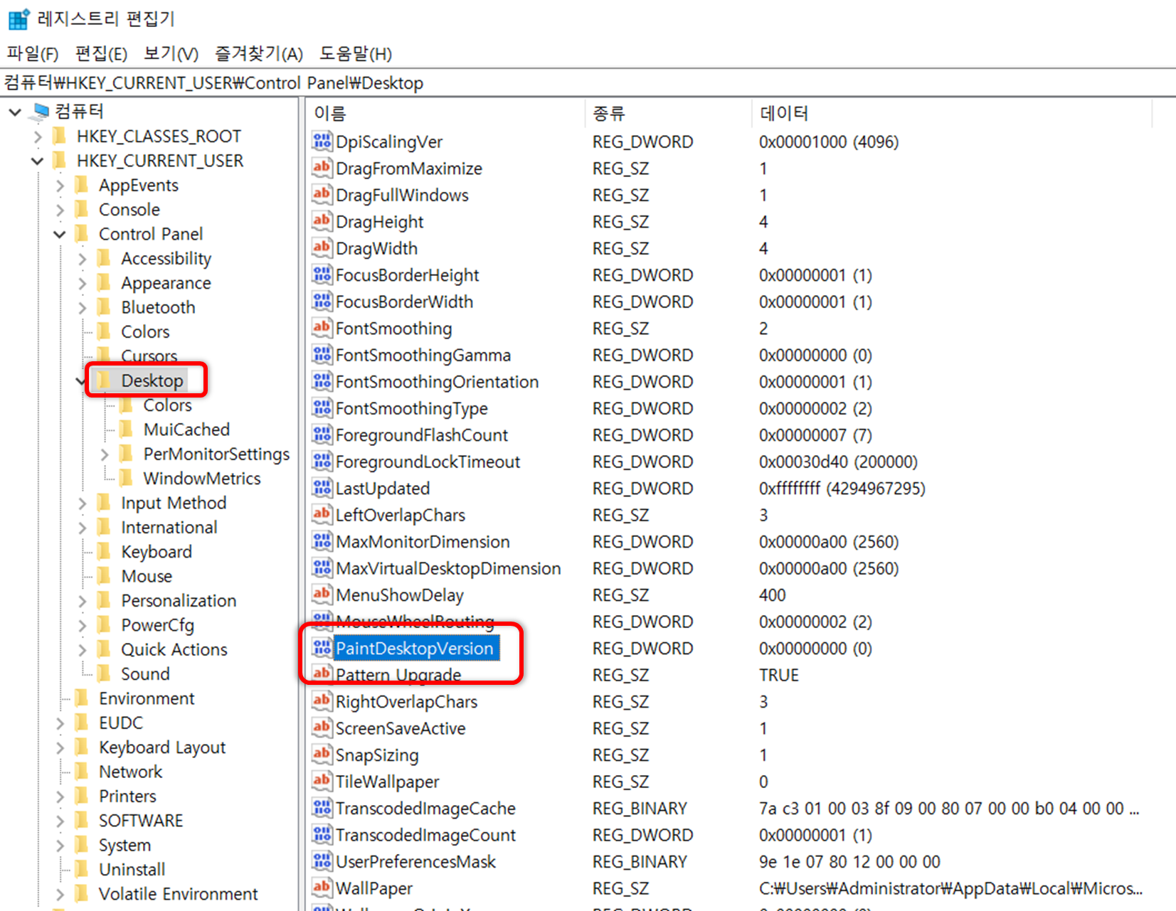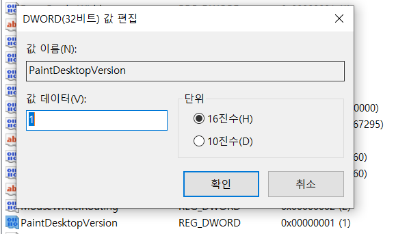 우측에 위치한 값중 PaintDesktopVersion의 값을 1로 변경해 줍니다.