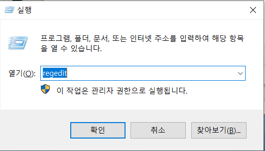 윈도우 키 + R을 눌러 실행에서 regedit을 실행합니다.
