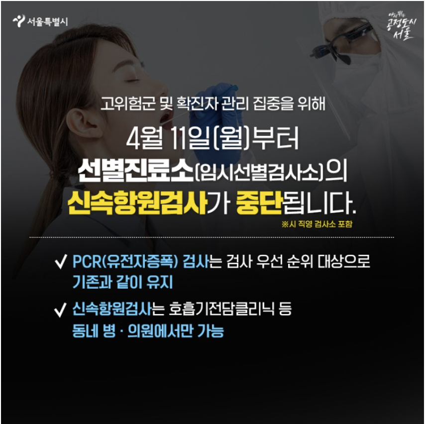 그리고 다음주 월요일인 4월 11일 부터는 선별진료소에서 신속항원검사가 종료됩니다.