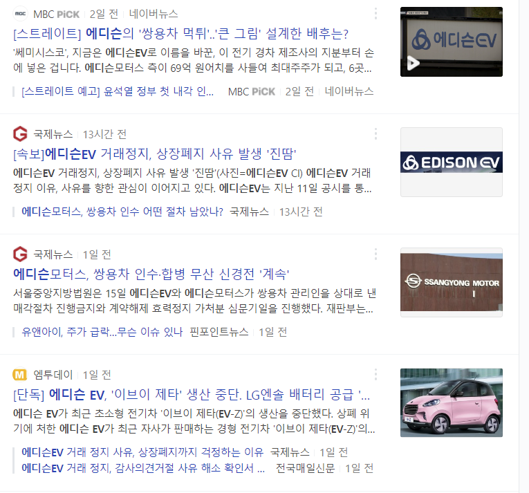 특히 에디슨EV는 최근 쌍용차 인수로 핫해서 주가가 엄청 널뛰었는데요.