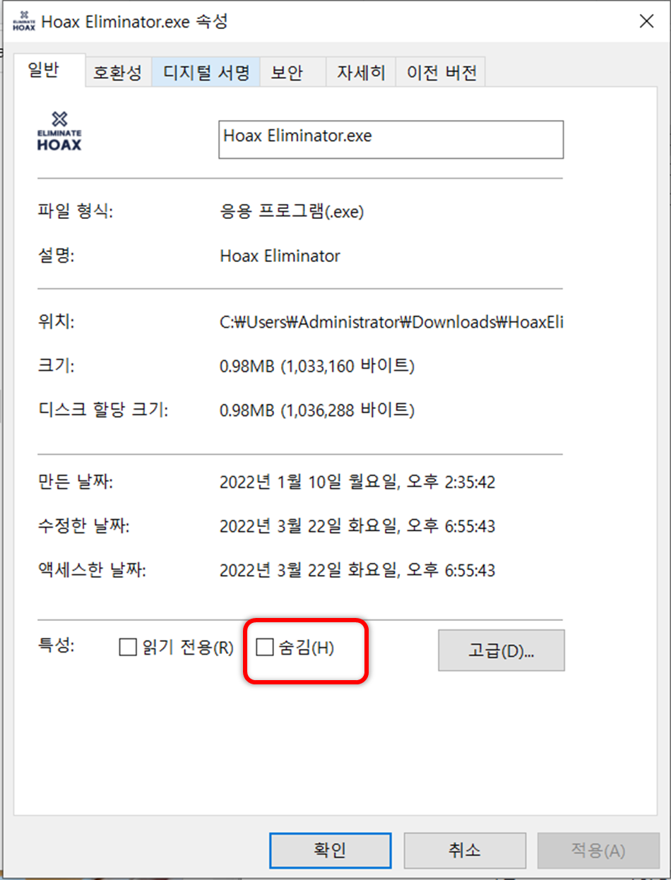 사용자가 사용하는 파일을 숨기기 위해서도 해당 속성에서