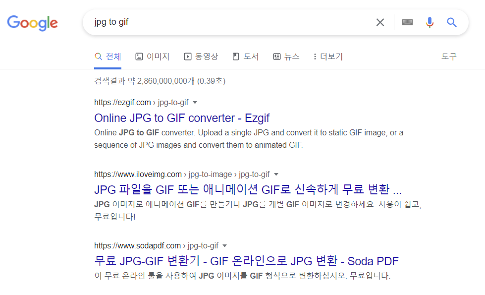 아래는 JPG to GIF를 검색해서 JPG파일을 GIF로 변경하는 프로그램이나 사이트를 검색한 것입니다.