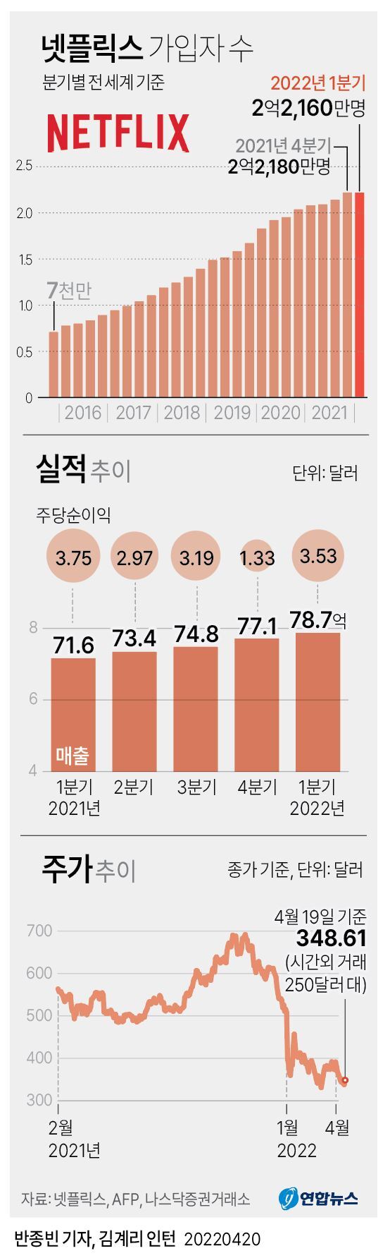 넷플릭스는 1분기 기준 가입자가 작년 동기보다 20만명 줄어 2억2164만명이라고 발표했습니다.