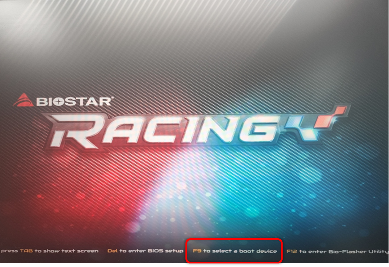 바이오스마다 다르니, 확인하시기 바랍니다. BIOSTAR의 경우 F9가 부팅 디바이스를 선택하는 키입니다.