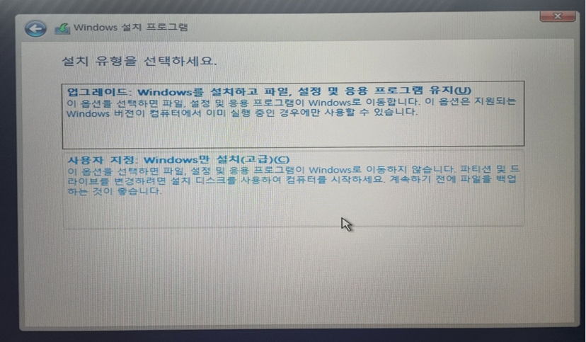 윈도우 설치시에는 기존을 업그레이드 할것인지 사용자 지정으로 클린 설치 할것인지를 선택해야 하는데요.