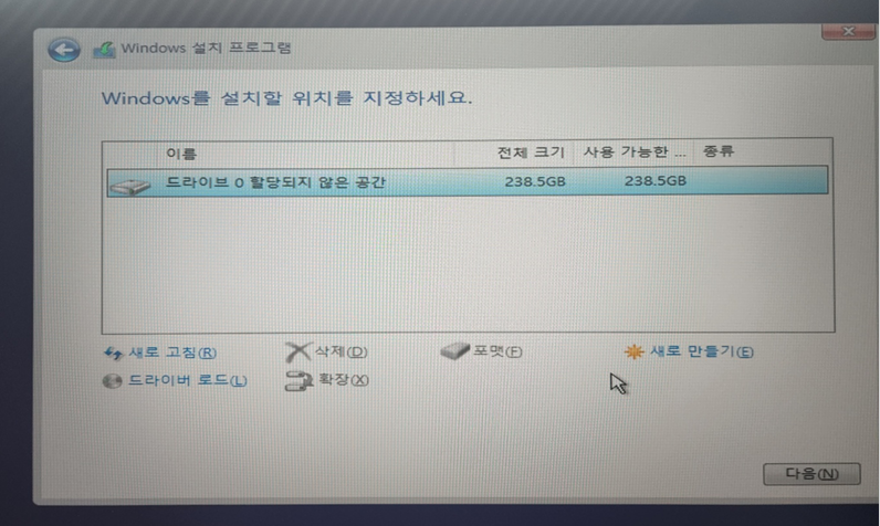 아래와 같이 1개의 할당되지 않은 공간이 되면 다음을 눌러 클린 설치하시면 됩니다.