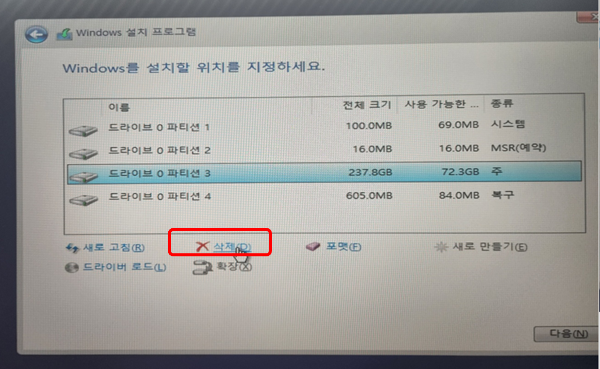 이 후 클린 설치를 위해 모든 파티션을 삭제하고