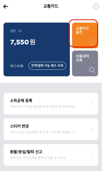 현재는 선불형 카드로 충전해서 사용하고 또 그마저도 계좌이체로만 된다는 점은 조금 아쉽습니다.