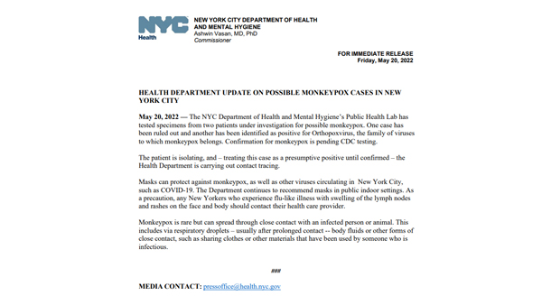 뉴욕시 보건당국은 이번에 원숭이두창 '양성 추정' 사례를 발표하면서,