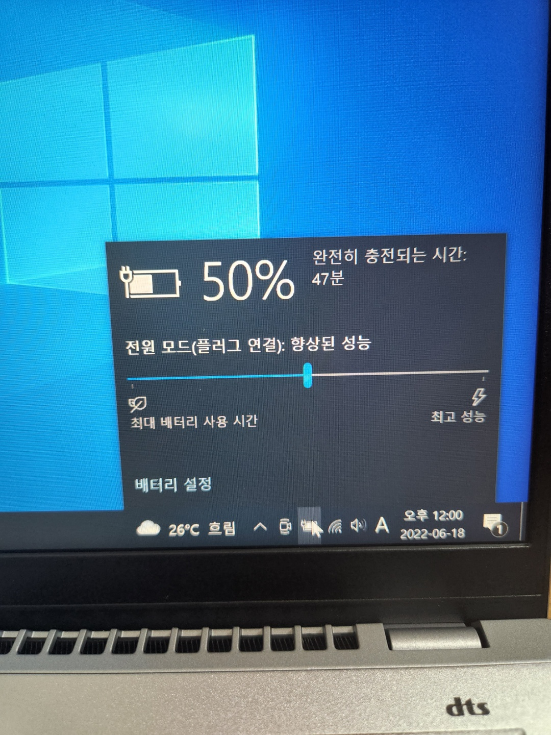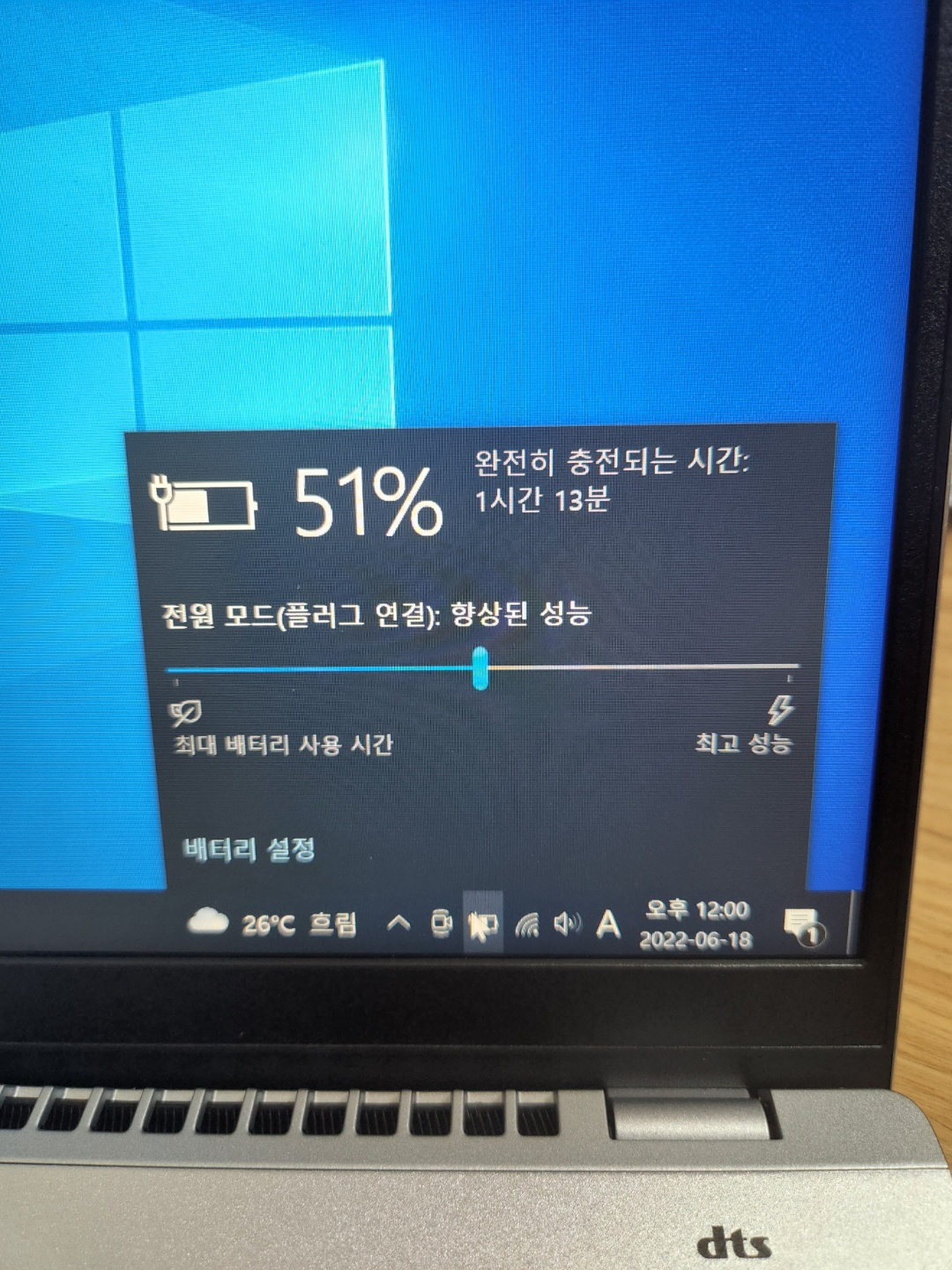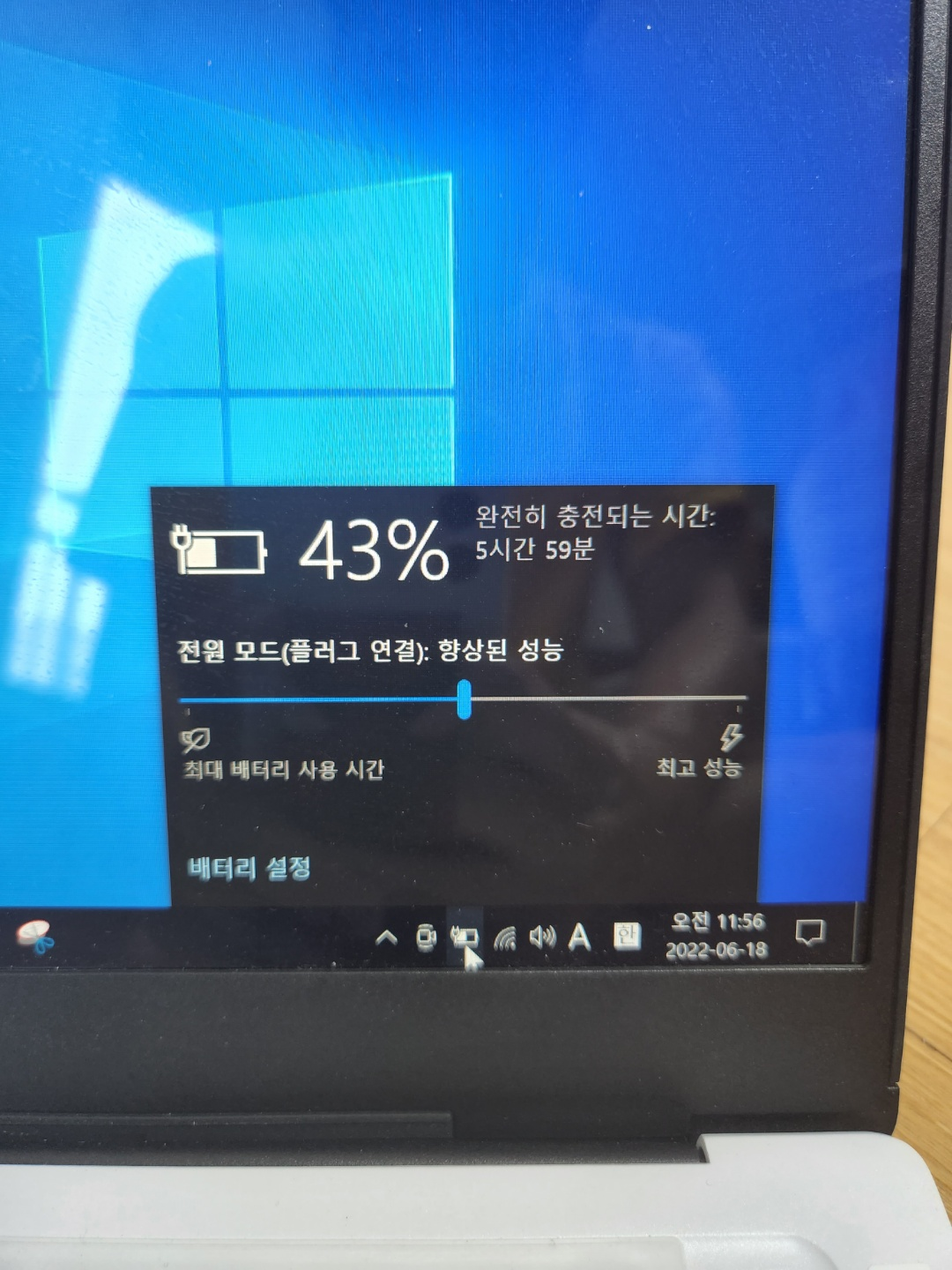 실제로 노트북에 표시되는 남은 충전시간도 차이가 났습니다.